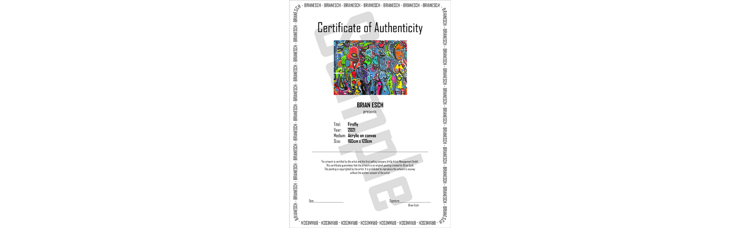 Dieses Bild ist ein original Acryl-Unikat und wird mit einem Echtheitszertifikat geliefert. Das Echtsheitszertifikat beinhaltet Name oder Nummer des Bildes, Künstler, Datum sowie Format und Medium. Meine Unterschrift garantiert euch, dass das Bild von mir (Brian Esch) gemalt wurde.